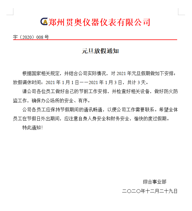 2021年元旦佳節(jié)將至,首先向全體員工致以節(jié)日的問(wèn)候,為了大家能度過(guò)歡樂(lè)、祥和、平安的節(jié)日,特提醒全體人員注意以下幾點(diǎn):