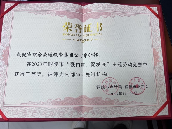 11月20日,市審計(jì)局舉辦全市內(nèi)部審計(jì)學(xué)習(xí)交流培訓(xùn)會(huì),表彰2023年全市“強(qiáng)內(nèi)審,促發(fā)展”主題勞動(dòng)競賽先進(jìn)單位,市交投集團(tuán)審計(jì)部榮獲三等獎(jiǎng),被評(píng)為“內(nèi)部審計(jì)先進(jìn)機(jī)構(gòu)”。
