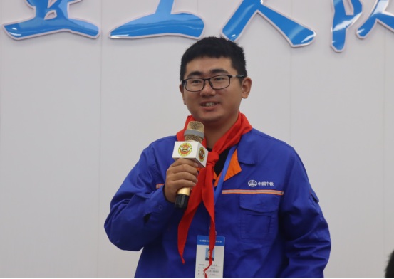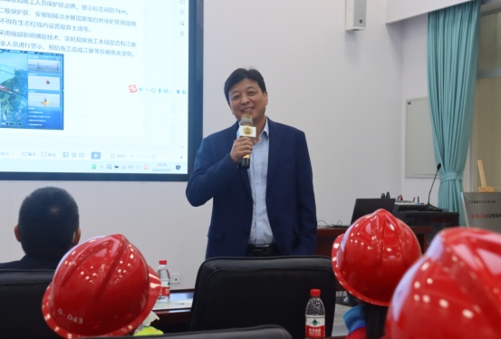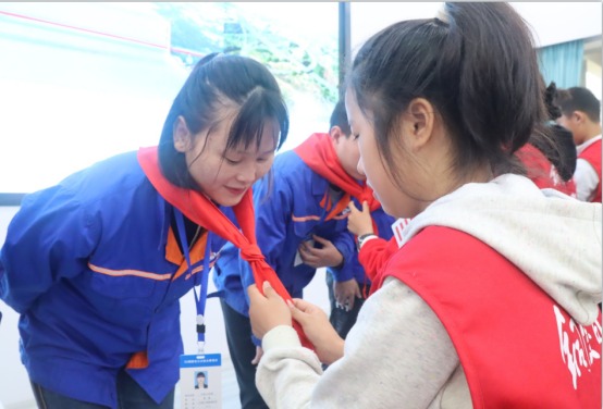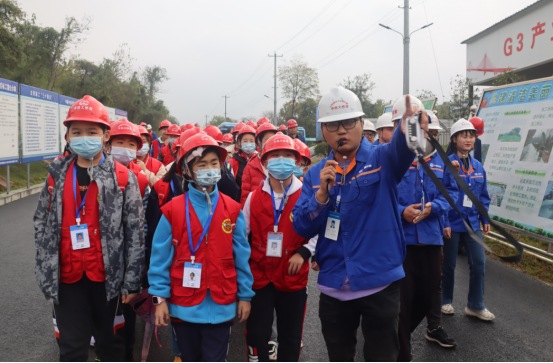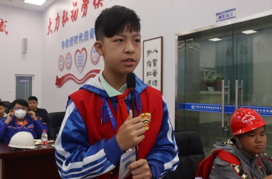 參觀結(jié)束后,小記者們來到展演廳,一起觀看G3橋建設(shè)宣傳片、聆聽G3橋安全總監(jiān)周啟輝講解生物多樣性相關(guān)知識(shí)以及G3橋建設(shè)期間對(duì)生物多樣性保護(hù)的措施。一張張?zhí)匦Ю瓭M的動(dòng)態(tài)效果圖,一幀幀凝聚著建筑工人汗水的畫面,給小記者們留下了深刻的印象。小記者代表們?yōu)榻ㄔO(shè)者們戴上鮮紅的紅領(lǐng)巾,表達(dá)對(duì)他們的崇敬之情。
