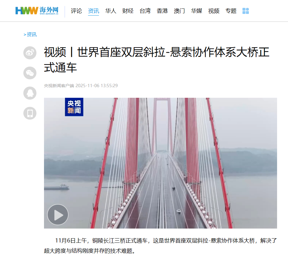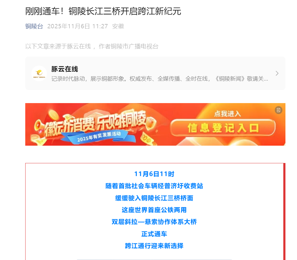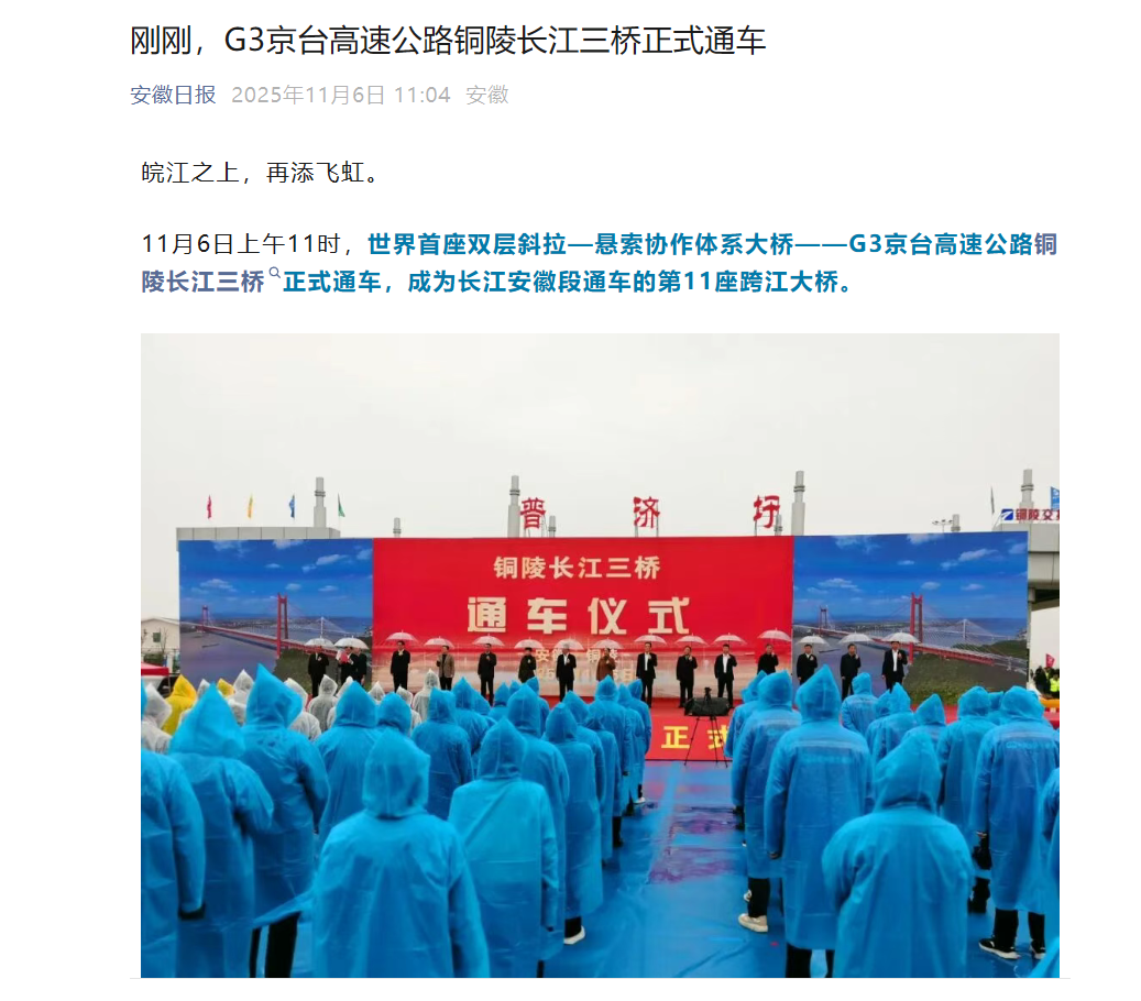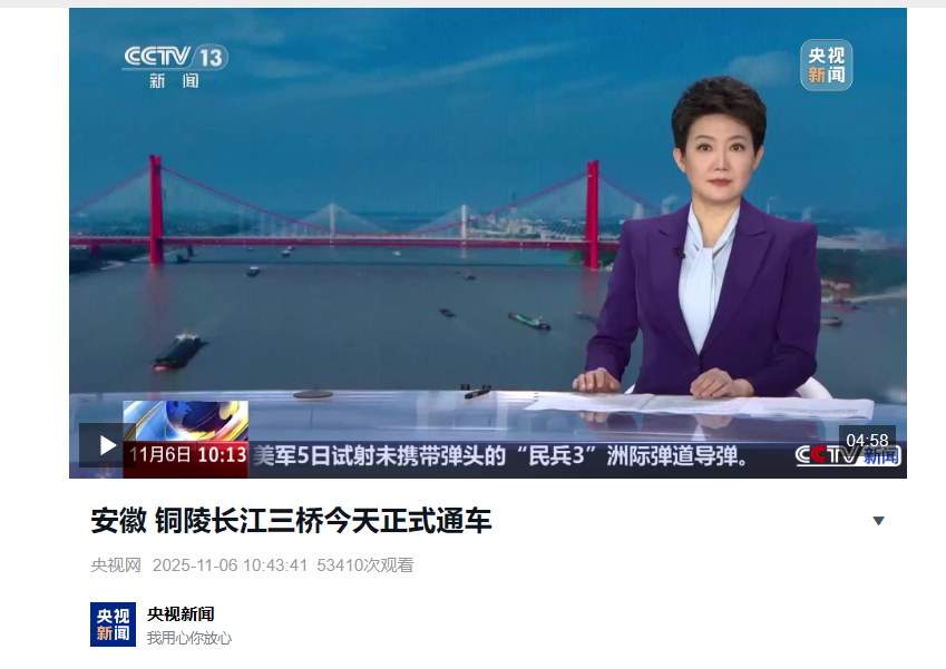 2025年11月6日,由銅陵交投集團投資建設、中鐵大橋院設計、中鐵大橋局施工的宏偉工程——世界首座公鐵兩用雙層斜拉—懸索協(xié)作體系大橋銅陵長江三橋正式通車,引發(fā)各大主流媒體高度關注。央視新聞、新華社、人民網(wǎng)等中央媒體全程直播報道,安徽日報、銅陵日報等省市媒體推出深度專題,海外網(wǎng)等網(wǎng)絡平臺多維呈現(xiàn),形成全方位、立體化的傳播矩陣。