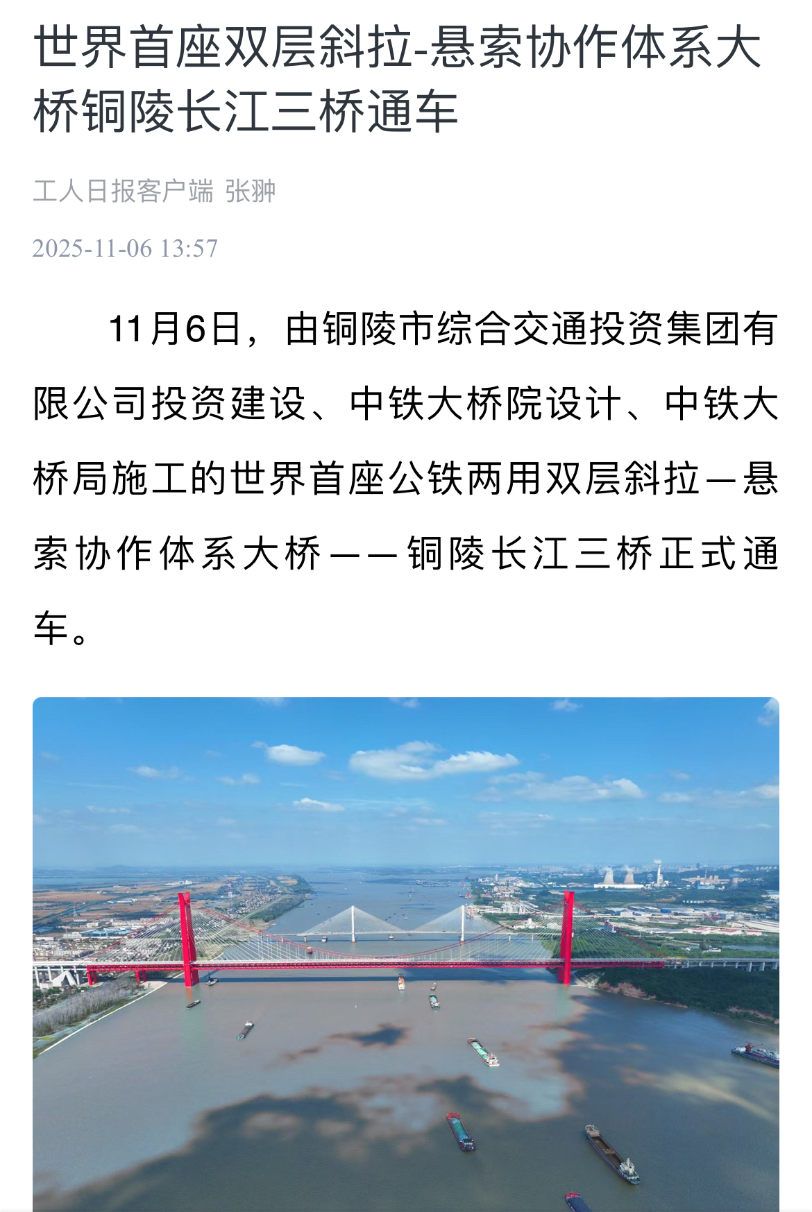 4.《工人日報客戶端》報道《世界首座雙層斜拉-懸索協(xié)作體系大橋銅陵長江三橋通車》