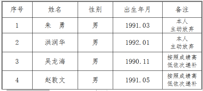 因出現(xiàn)部分考生自愿放棄情況,我公司對(duì)入圍體檢人員按照成績(jī)排名依次進(jìn)行遞補(bǔ)?,F(xiàn)將交投集團(tuán)司屬公司銅陵市江北公路管理有限責(zé)任公司收費(fèi)員、監(jiān)控員崗位招聘遞補(bǔ)入圍體檢人員名單公告如下: