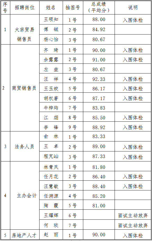 因公司經(jīng)營業(yè)務(wù)發(fā)展需要,根據(jù)應(yīng)聘者現(xiàn)場面試綜合能力表現(xiàn)情況,結(jié)合公司儲(chǔ)備人才需求,經(jīng)集團(tuán)公司黨工委會(huì)議研究決定,現(xiàn)將交投集團(tuán)公司商貿(mào)銷售員等崗位招聘情況公示如下: