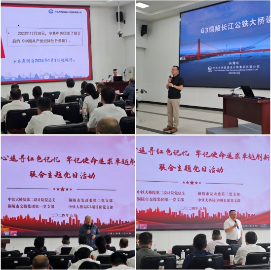 現(xiàn)場參觀過后,在G3大橋項目部會議室,中鐵大橋院黨建工作部部長劉建軍、中鐵大橋院總工程師、G3銅陵長江公鐵大橋總設(shè)計師肖海珠分別以《中國共產(chǎn)黨紀(jì)律處分條例》解讀、斜拉懸索協(xié)作體系橋設(shè)計為題作了輔導(dǎo)講座,并與聯(lián)合單位進行了交流探討。集團公司黨委副書記方勁松、中鐵大橋局G3項目部經(jīng)理劉幸福參與交流。