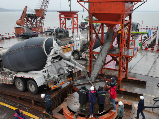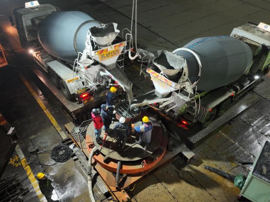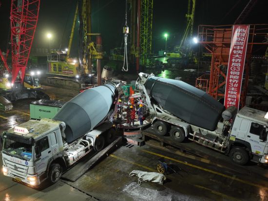 “此次灌注的是3號主墩19號樁。3號主墩共有68根鉆孔樁,每根樁直徑3.0米,樁長95米,成孔深度達122.5米,入巖深度約71.4米,鉆進施工采用徐工XR580HD、XR600E和XR700型旋挖鉆機逐級擴孔鉆進成孔?!敝需F大橋局G3銅陵長江公鐵大橋項目一分部總工程師宋海濤介紹,G3銅陵長江公鐵大橋是世界首座雙層斜拉-懸索協(xié)作體系大橋,3號墩和4號墩是大橋的兩個主墩,承載988米的主跨一跨過江。